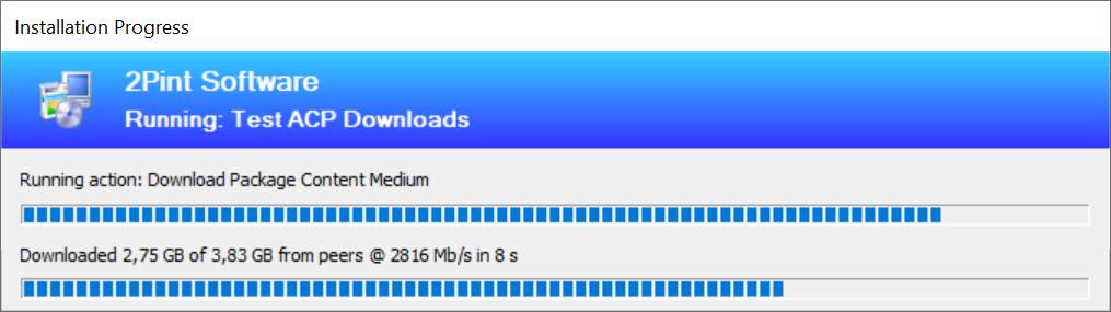 In the picture above, you can see the wording "Downloaded 2.75GB of 3.83GB from peers", which means all of it is Turboing, in this case, hence the speed, all coming from the local cache. The picture below shows the different progress when BITS (No Turbo) is running: