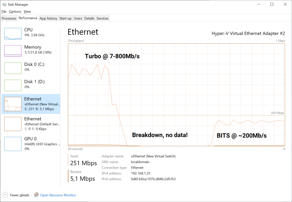 So by doing these two changes, you can kind of get around 200Mb/s on modern hardware, which isn't too bad. Sometimes faster downloads, mostly because BranchCache finds duplicates in its own file. The following picture shows where the BITS jobs finds local content and doesn't have to query the network, peaking the speed to above 300Mb:
